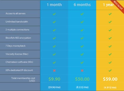 玩家可以专心使用,沉浸在游戏中,愉快地玩游戏,同时玩家会获得永久的VIP免费使用特权。支持 Open加速器、PPTP 和 L2TP/IPSec 协议。他们的计量计划是可共享的。价格从每月 10 美元起,季度和年度账户都有折扣。他们为 Windows、Mac、Linux、iOS 和 Android 设置了指南。如需更多优惠,注册两个月只需 14。